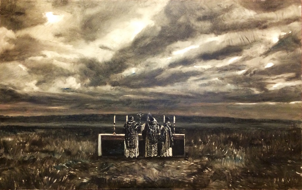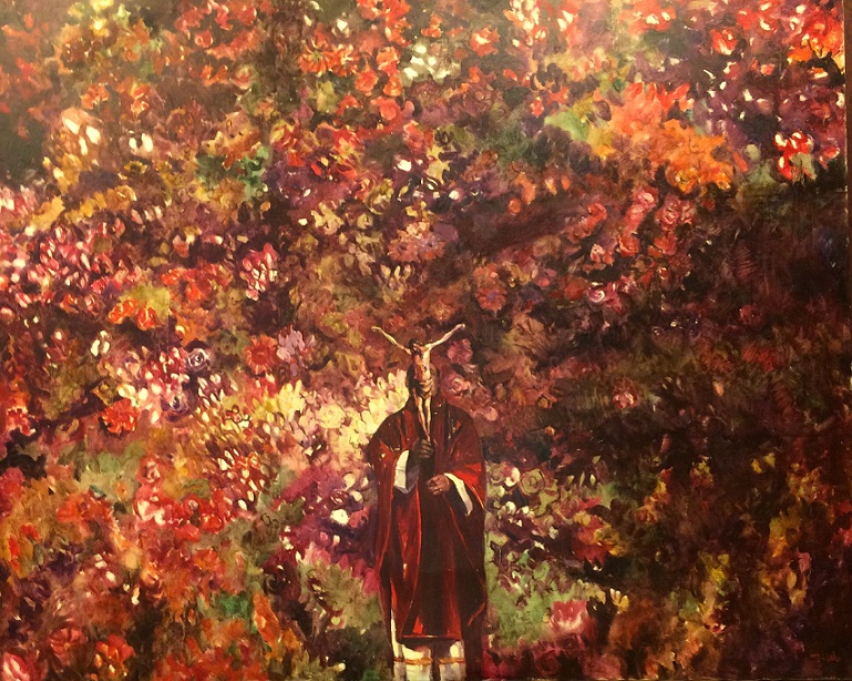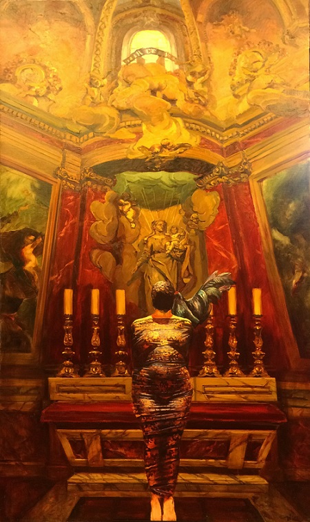 Life in the countryside is an archetype that inspires him and where he places the scenes that take place in the paintings, in the hills near his home in Socolari. The female character appears with a corset, shrouded in mystery and lace before the altar, ready for the sacrifice.