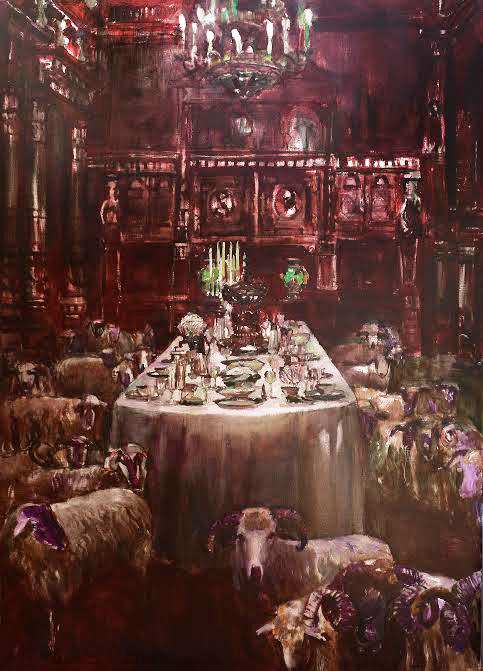 Our attention was drawn by the paintings of Gheorghe Fikl that fascinate us with the combination of sensual and funeral, erotic and obscure. His paintings are characterized by surreal type associations where the horizontal space is dominated by the animal and the vertical space lifts us, transcends. Symbol painted animals are usually bulls, sheep, peacocks, dogs, placed in the luxurious spaces, decadent, adorned with tents, glittering chandeliers that introduce us to a magical realism. The animal shapes are well defined with a special attention for the colors used in an absolutely figurative manner.