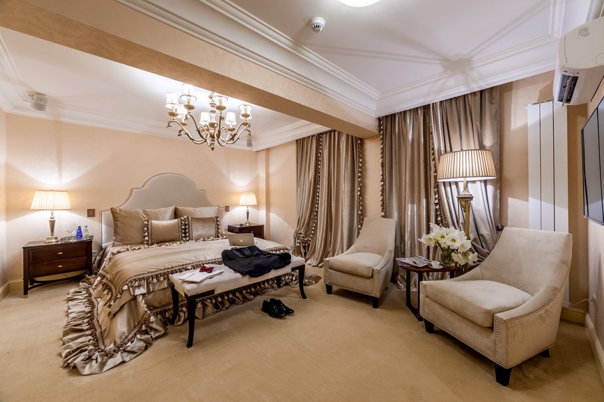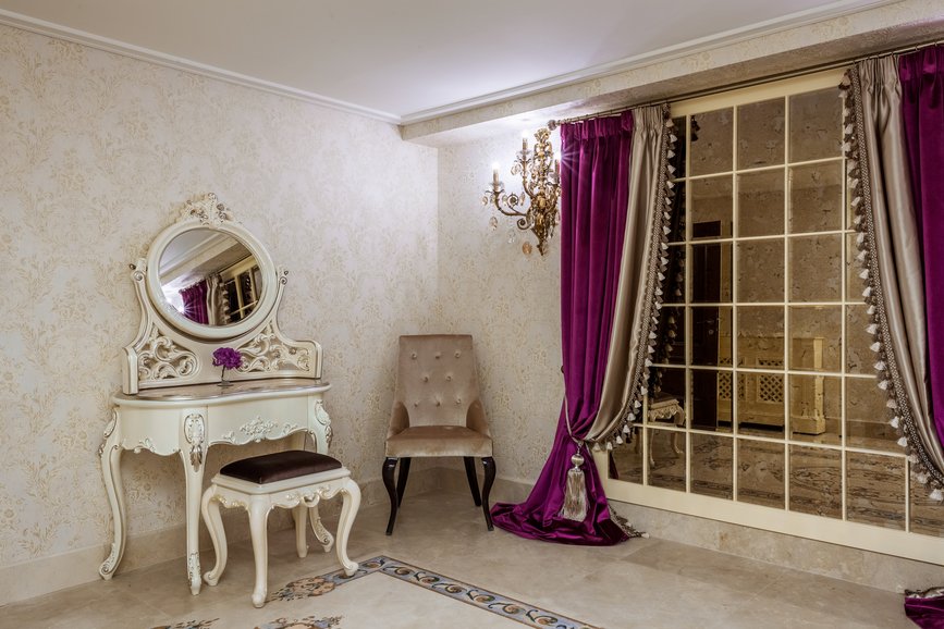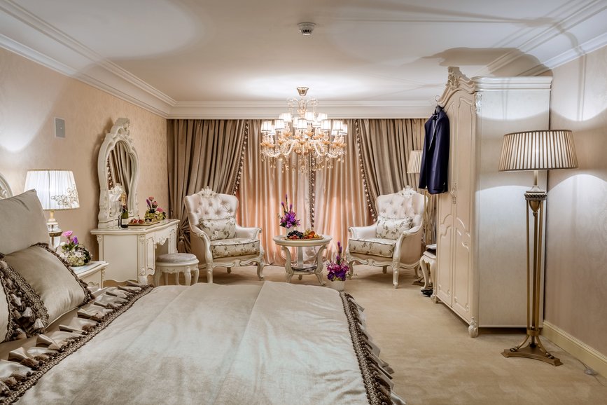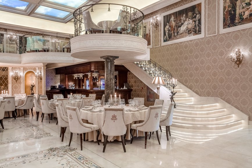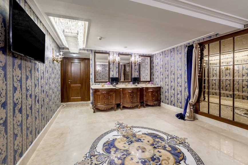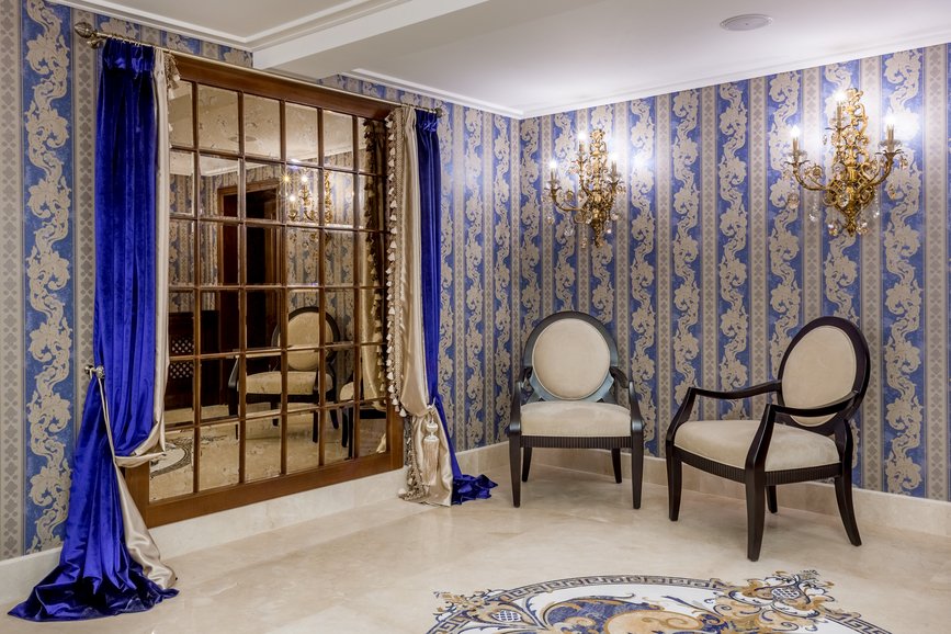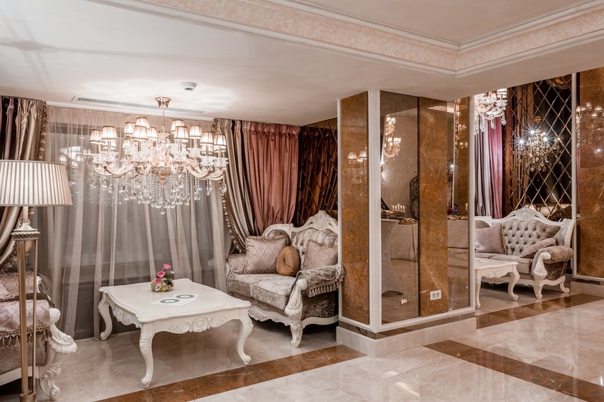 Special finishes, generous interiors, floors and columns of marble, stuccoes, oil paintings adorning the walls, wall paintings, velvet upholstered armchairs, large curtains, huge crystal chandeliers, coffered ceiling, carved furniture, all these can compete in luxury and sumptuousness with the interiors of the castles from old times.