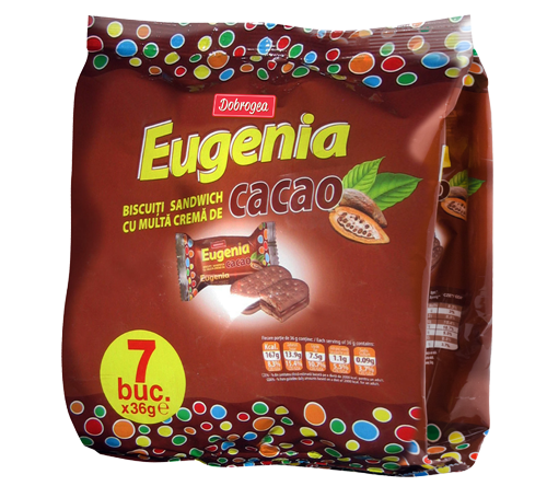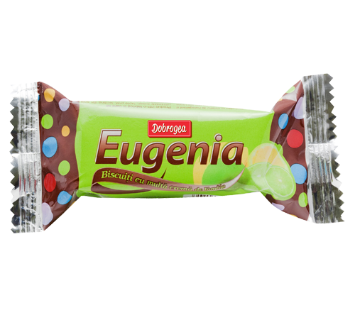 Today, the Dobrogea factory uses the “Eugenia” brand name, which it has owned since 1997. The product range has expanded, and it now includes varieties such as Eugenia Original, Eugenia with vanilla cream, cocoa cream, lemon cream, Eugenia Junior with milk and honey, Eugenia Dark, and Eugenia with apple and cinnamon.