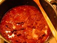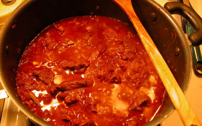 To cook it, what you need to do is first wash the meat, cut it into small pieces, and sprinkle it with pepper. Then peel the onions and garlic and chop them into small pieces. Heat the butter, and when it is hot, you can add the meat. Fry the pieces on all sides until they become slightly brown. Next, add the onions and garlic and let them cook with the meat. Now you can add the paprika, salt, bay leaves, vinegar, tomatoes, and 700 ml of water. You should let everything simmer for about an hour and a half.