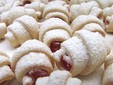 Shaping the croissants: Divide the dough into 3 equal parts. Roll one part into a circle about 30–35 cm in diameter. First cut the circle in half, then into quarters, then into eighths, and finally cut each eighth in half to obtain 16 triangles. Place a small piece of Turkish delight on each triangle (you can cut or shred it beforehand). Roll each triangle from the base to the tip and place it on a baking tray lined with parchment paper. Bake in a preheated oven at 170°C for about 15 minutes. Remove them, place them in a bowl, and dust with powdered sugar while still hot so the sugar sticks.