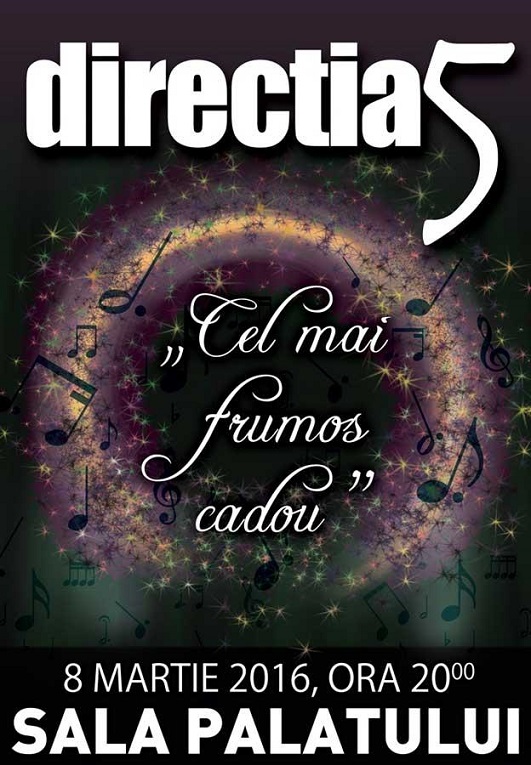"Il regalo più bello" ("Cel mai frumos cadou") è regalato a voi dalla band Direcţia 5, il 8 marzo 2016 alla Sala del Palazzo, a partire dalle 20:00. In una serata speciale, dedicata alle donne, il romanticismo si fonde perfettamente con il pop-rock in un evento di musica dal vivo che vi farà evadere dalla vita di tutti i giorni e vi farà vibrare alla massima intensità con Direcția 5 ed i loro ospiti.